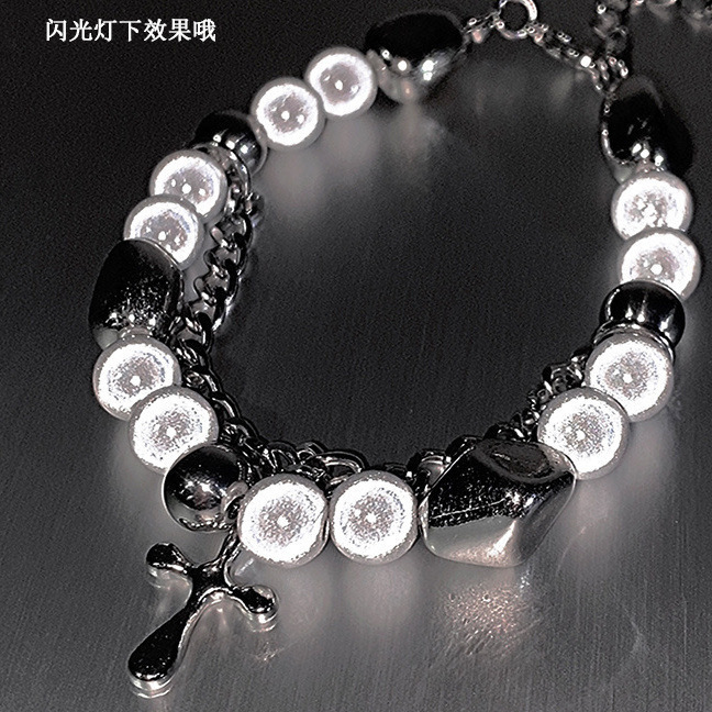 Cross Reflective Pearl Bracelet Women's Stitching Ins Trendy Elegant Niche Double Layer Design Personalized Hip Hop Cool Bracelet