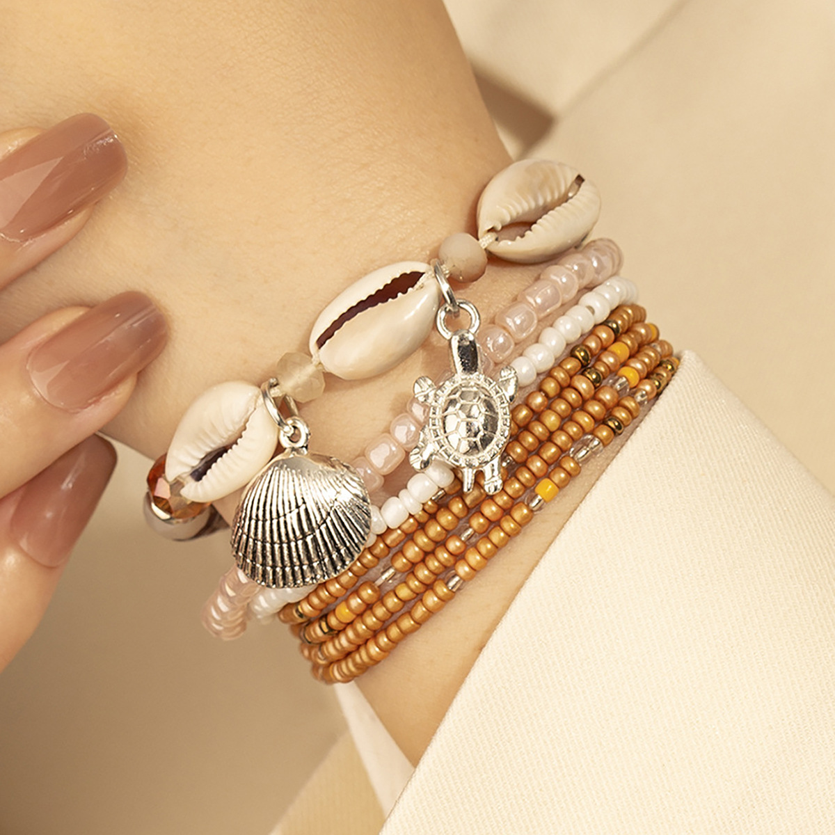 Summer Dopamine Vacation Style Multi-Layered Beaded Contrasting Color Shell Starfish Anklet Bracelet Set Rice Beads Rhinestone Anklet