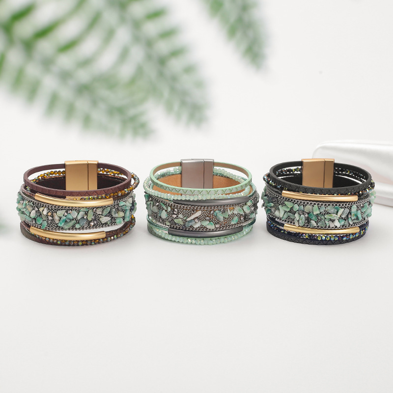 Boho Handmade Gravel Rice Beads Women's Leather Bracelet Ethnic Style Wide Edge Magnet Buckle Ladies Bangles