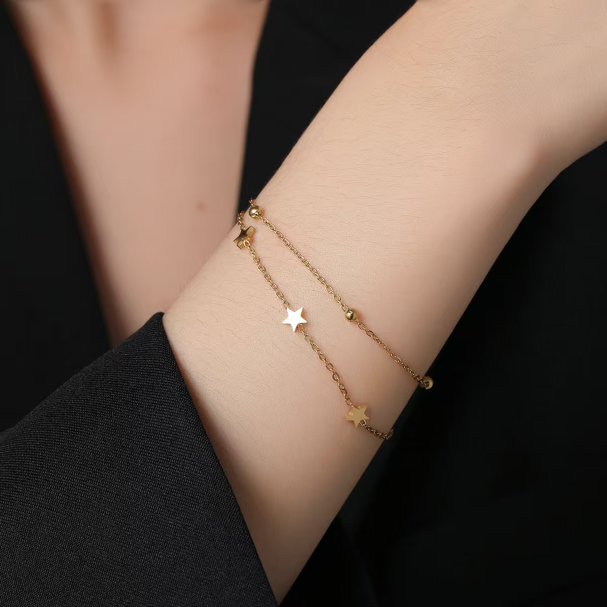 Cross-Border New European and American Fashion Simple Round Bead Five-Pointed Star Stainless Steel Non-Fading Double-Layer Bracelet Women's Jewelry Wholesale