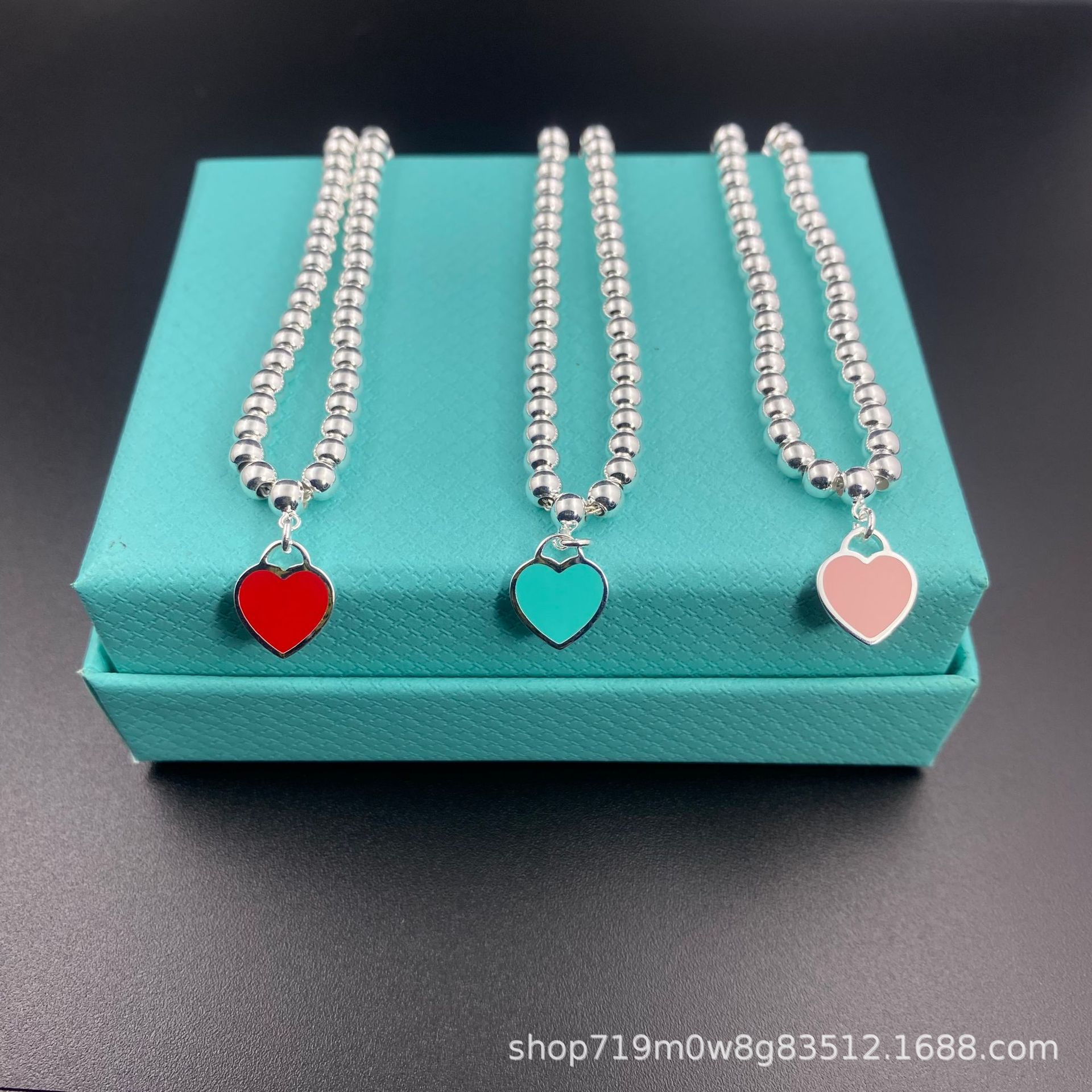 T's Classic S925 Heart-Shaped Enamel 4mm Beads Heart Double Chain Blue Red Pink Pendant Round Beads Girls Bracelet