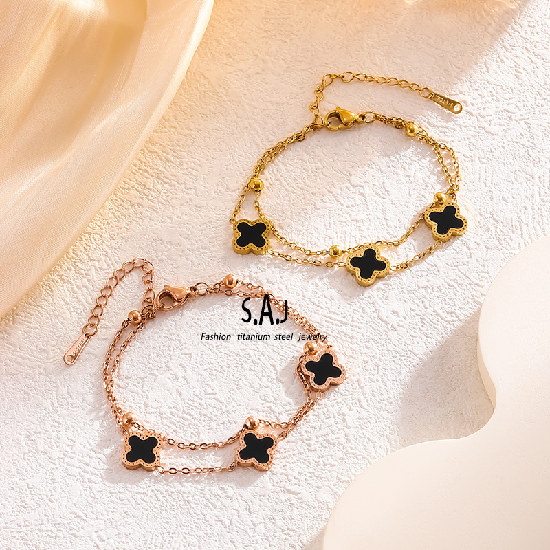 Japanese and Korean version of double-layer lucky three-flower four-leaf clover beaded titanium steel bracelet girls new all-match sweet temperament wholesale