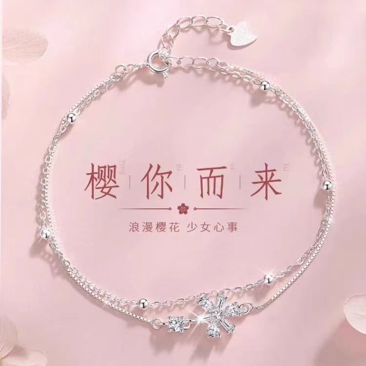 Girl's Heart Cherry Blossom Double-Layer Bracelet Women's Dream Romantic Zircon Flower Bracelet Tanabata Valentine's Day Gift Jewelry