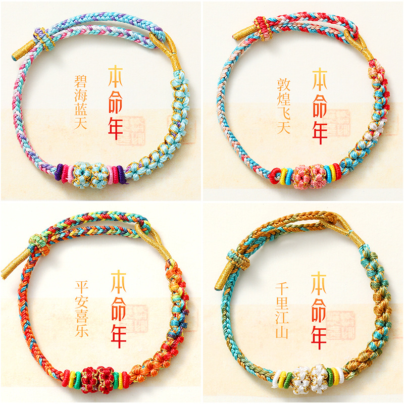 Chinese Style Peach Blossom Knot Braided Rope Bracelet with Gold Transfer Beads Red Rope Colorfulful Hand Ornaments Year of the Horse Animal Year Bracelet for Women
