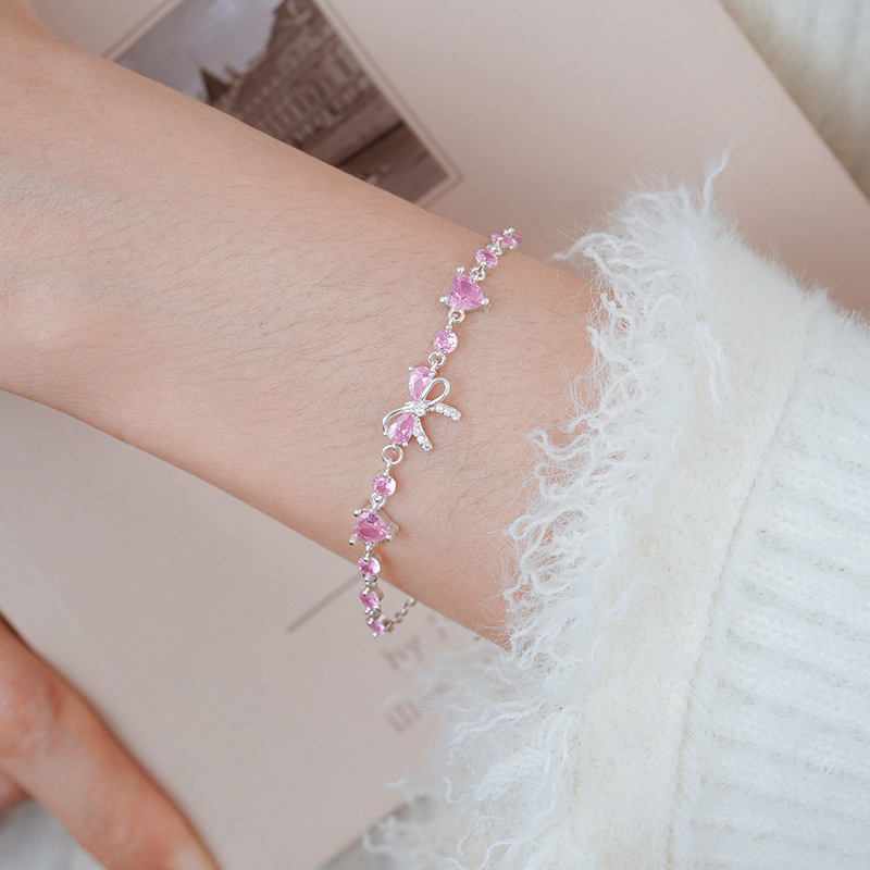 Sweet Girly Heart Pink Diamond Bow Bracelet for Women 2025 New Ins Style Accessible Luxury High-End Niche Hand Jewelry