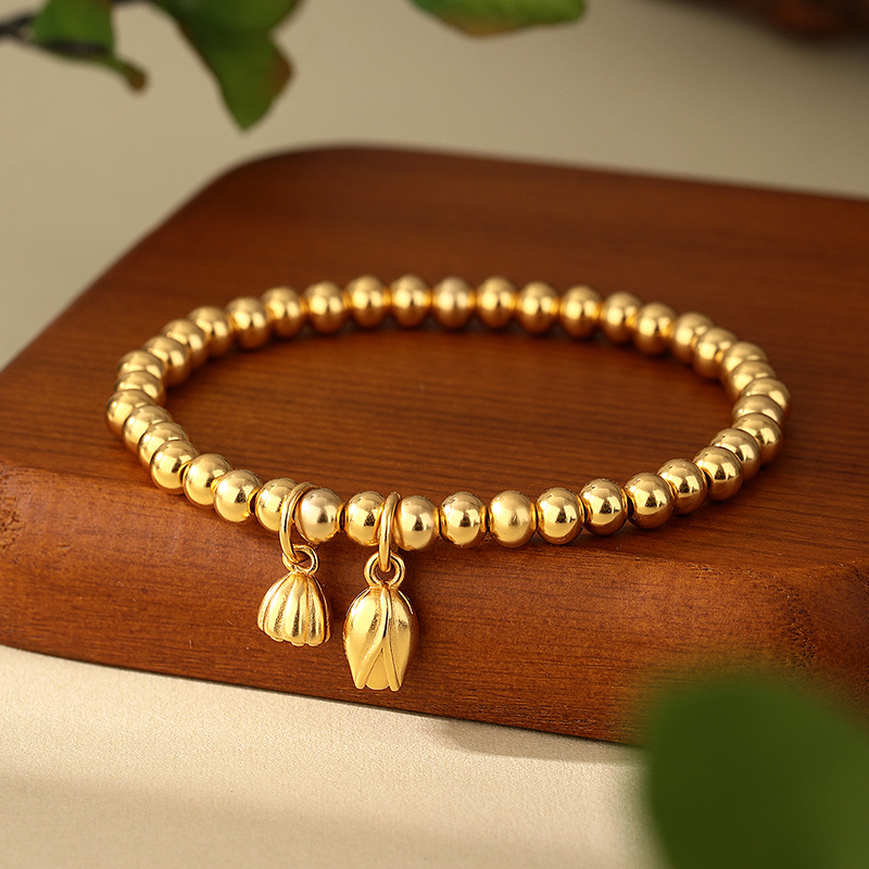 Bracelet Women's Copper Gold Plated Two-Shihuan Ethnic Style Chain Lotus Jewelry Girl's Hand Jewelry Simple Elegant Bracelet
