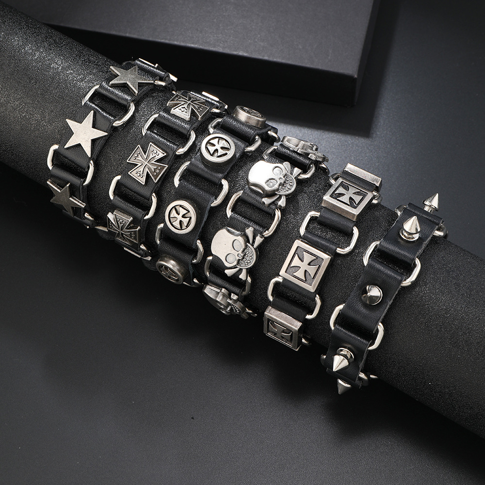 Cross-Border Punk Bracelet, Simple Leather, Personalized Skull Rivet Accessories, Adjustable Men's Motorcycle Bracelet Chain