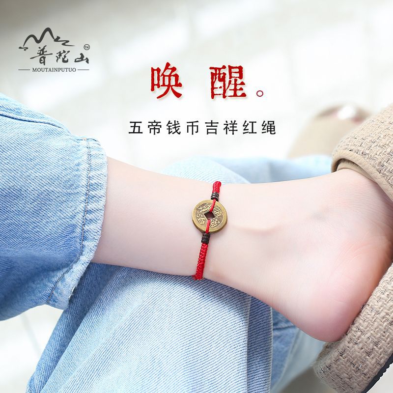 Putuo Mountain Five Emperors Coin Bracelet Women's Zodiac Year Copper Coin Agate Hand-Woven Red Foot Rope Men
