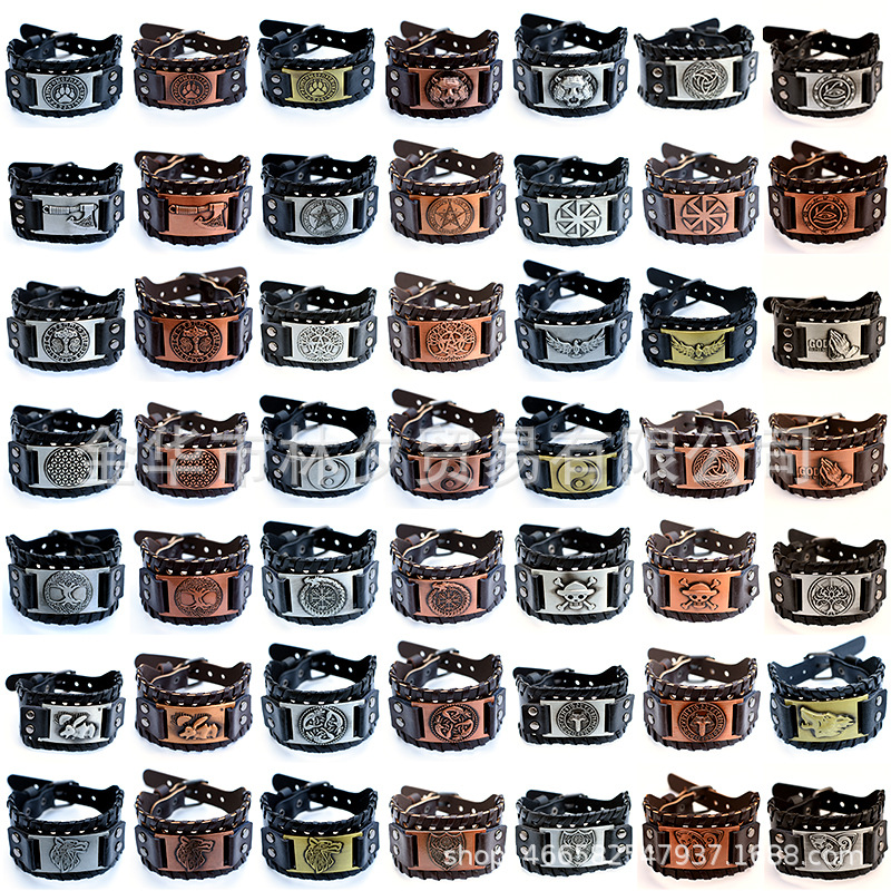 Cross-border Hot Selling Nordic Vintage Men's Viking Totem Leather Bracelet Wolf Head Bear Claw Gossip Tree of Life Logo Bracelet