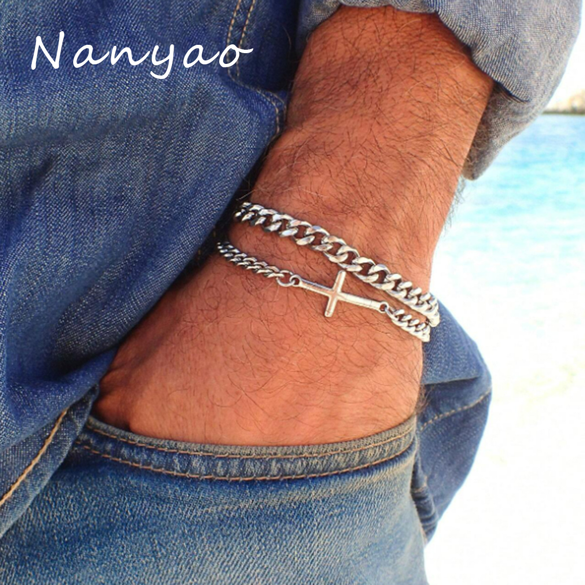 [NANYAO] Punk style titanium steel men's double-layer cross bracelet six-sided grinding Cuban chain cross-border hot sale