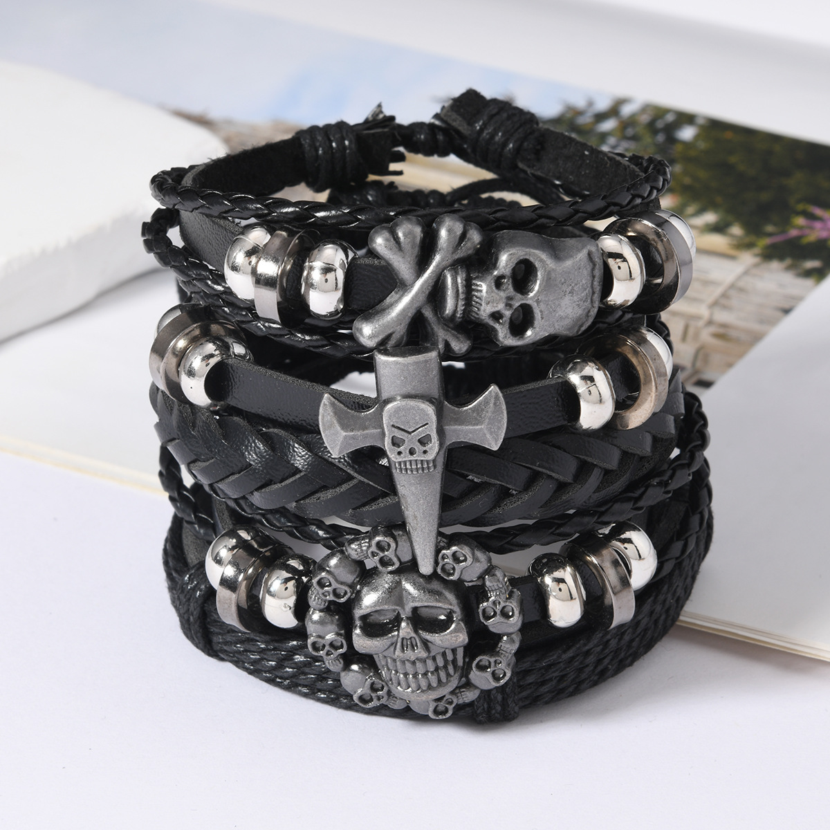 Cross-border New Punk Skull DIY Hand Rope Men's Hand-woven Multi-layer Leather suit Bracelet