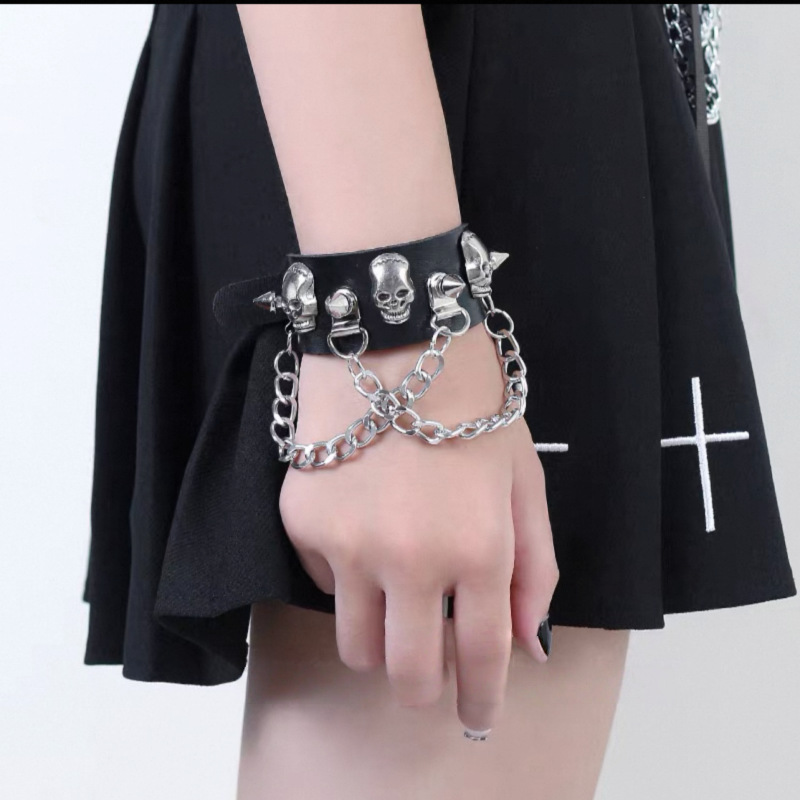 Cross-Border Hot Selling Punk Style Bracelet Skull Rivet Tassel Chain Couple Bracelet Men's Leather Wrist Strap Jewelry