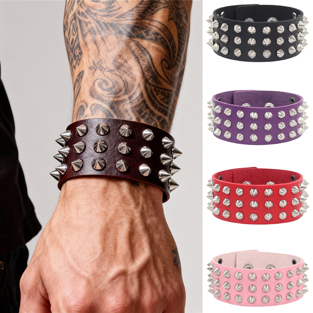 Eco-Friendly Pu Leather European and American Fashion Men's Three-Row Rivet Bracelet Exaggerated Hip-Hop Rock Punk Leather Bracelet Bangle
