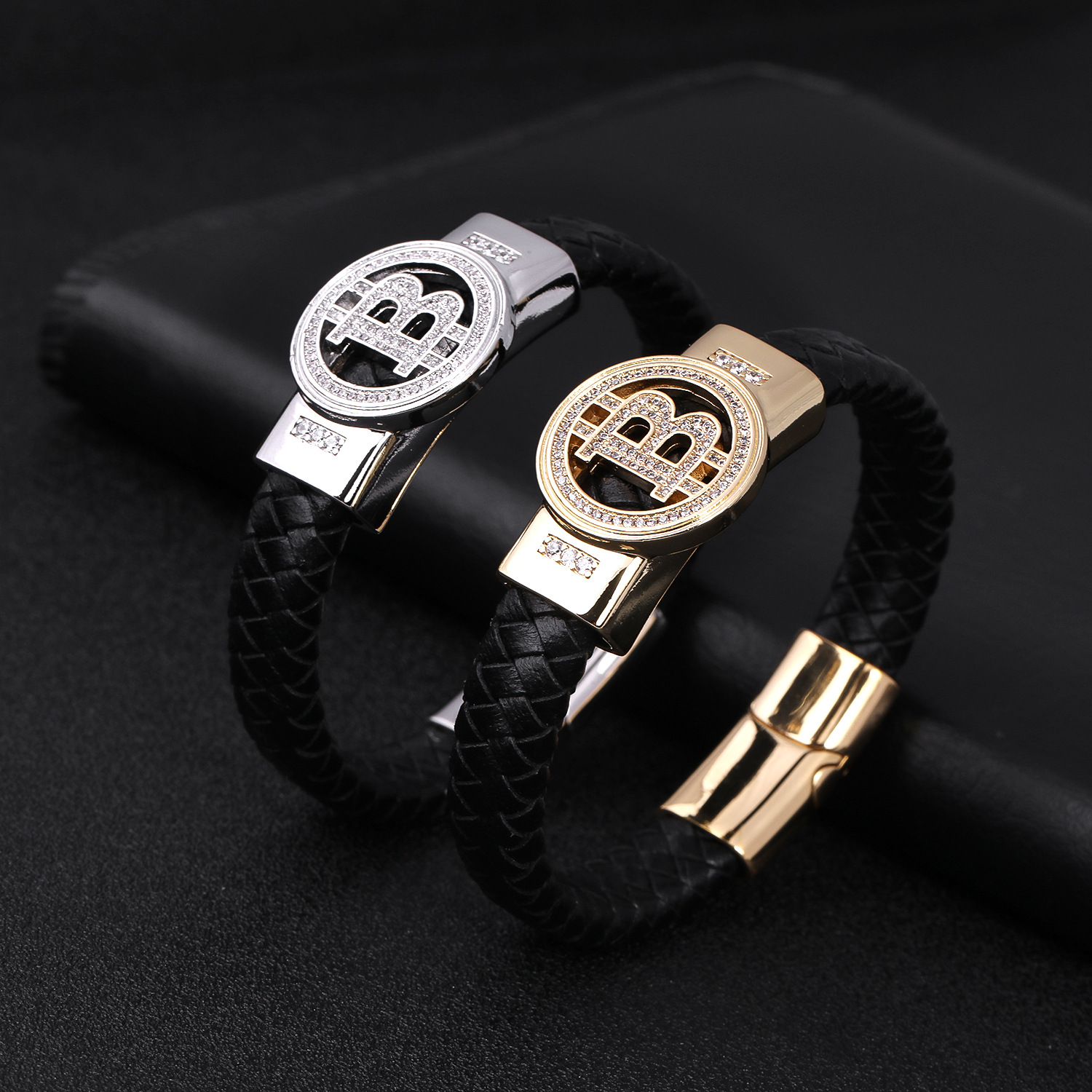 Genuine Leather Braided Leather Titanium Steel Bracelet Men's Trendy Stainless Steel White Gold Diamond-Encrusted B-Shaped Letter Cowhide Bracelet