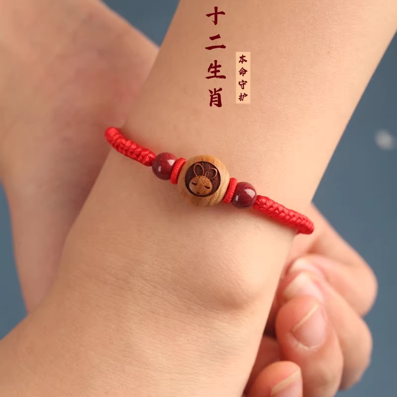 2026 Zodiac Year Peach Wood Zodiac Sign Peace and Safety Cinnabar Red String Braided Bracelet for Children and Babies
