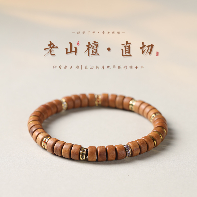 Guofeng Indian Old Sandalwood Bracelet Wen Play Pills Beads Gold and Silver Wrap Edge with Color Diamond Spacer Single Circle Bracelet for Men and Women