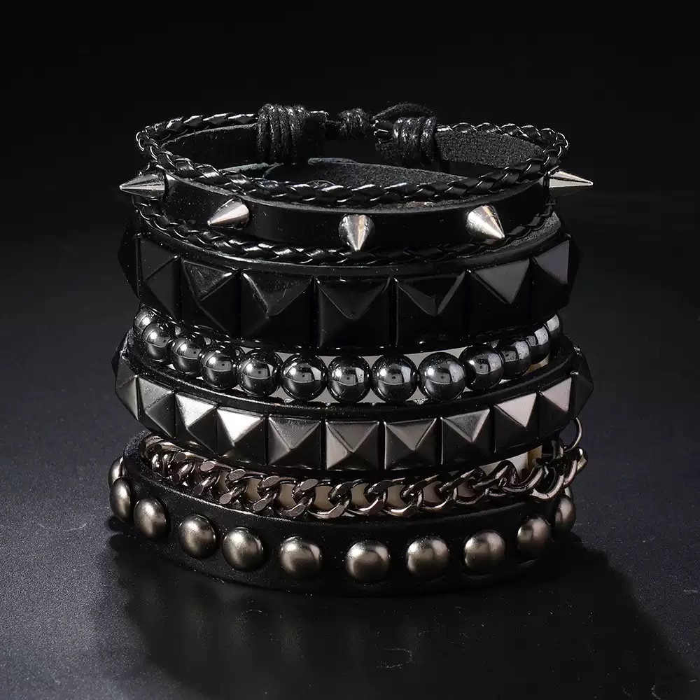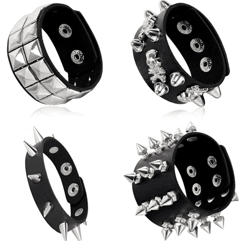 European and American Cross-Border Punk Style Four-Piece Rock Pointed Rivet Bracelet Set Men's Trendy Wrist Strap Bracelet Jewelry