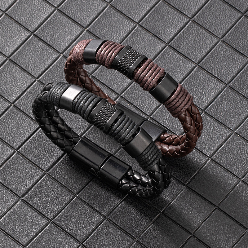 Cross Border Men hand woven pu bracelet fashion jewelry magnet buckle leather bracelet double layer design DIY wholesale