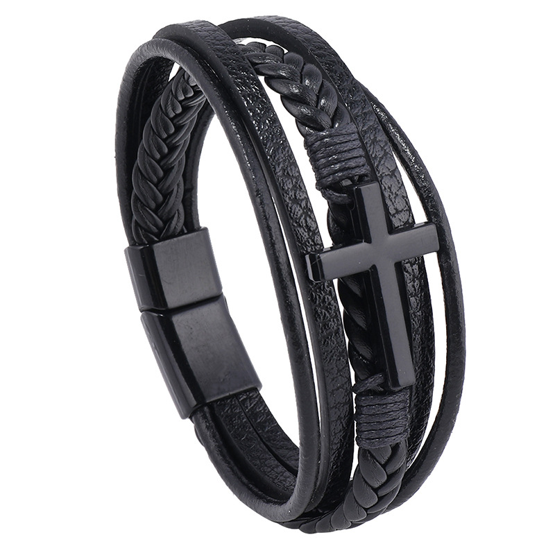 Amazon Hot New Cross Leather Bracelet Men's Multi-layer Hand-woven Rope Magnetic Buckle PU Bracelet