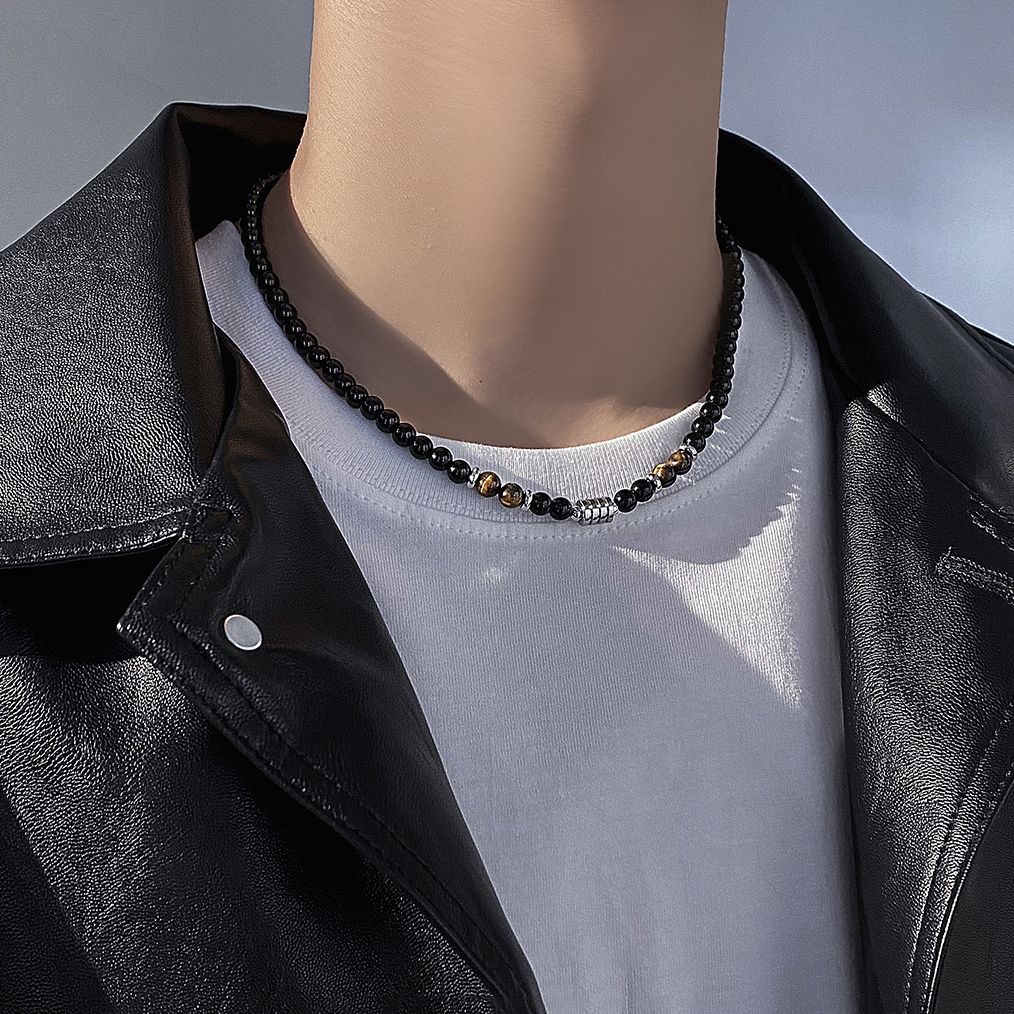 Niche design high-end feeling new stainless steel men's necklace natural tiger eye stone map stone beaded OT buckle necklace