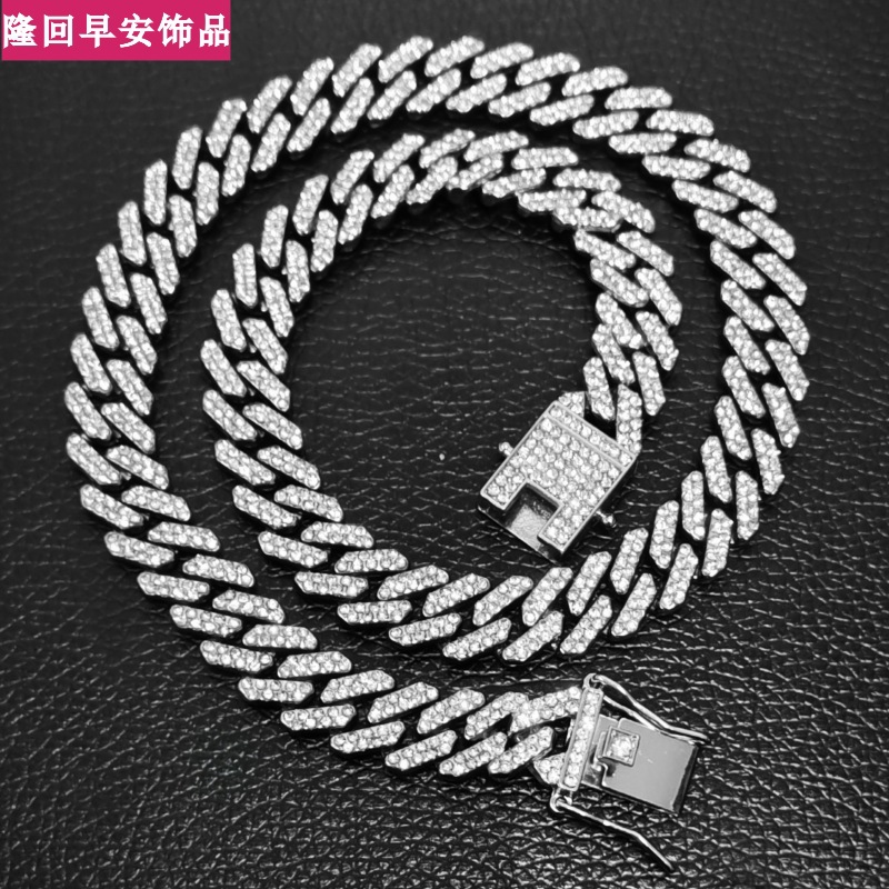Europe and the United States new 12mm strip men's Cuban chain necklace gold-plated diamond alloy hip-hop chain cross-border supply