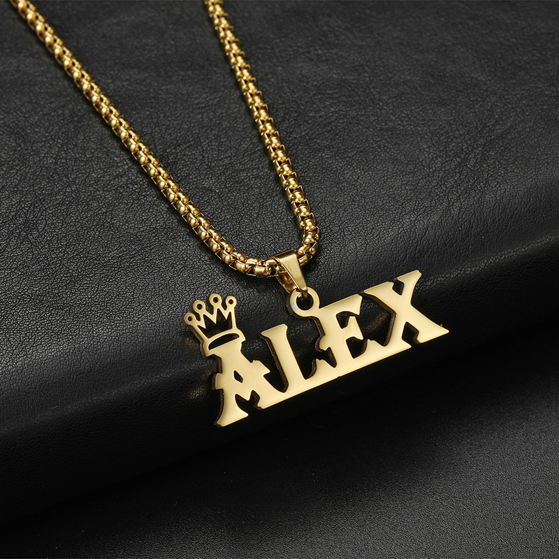 European and American Export diy English Letter Name Stainless Steel Necklace Square Pearl Chain Crown Pendant Men's Hip-hop Jewelry