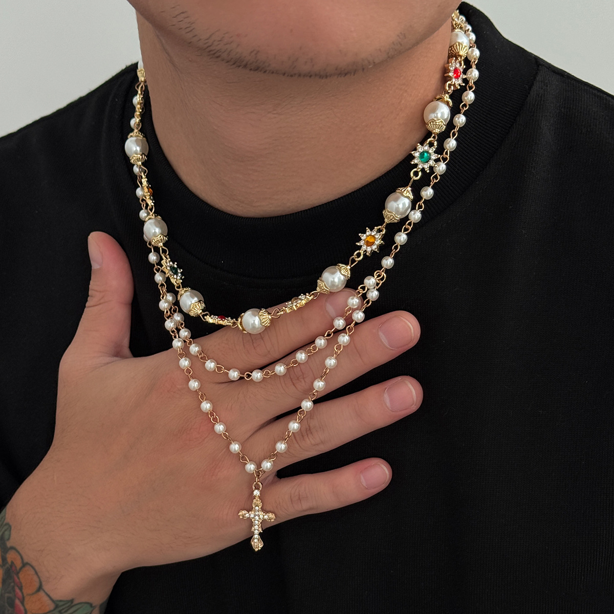 European and American Cross-Border Imitation Pearl Cross Pendant Necklace Men's Hip-Hop Niche Men's Diamond Flower Clavicle Chain Jewelry