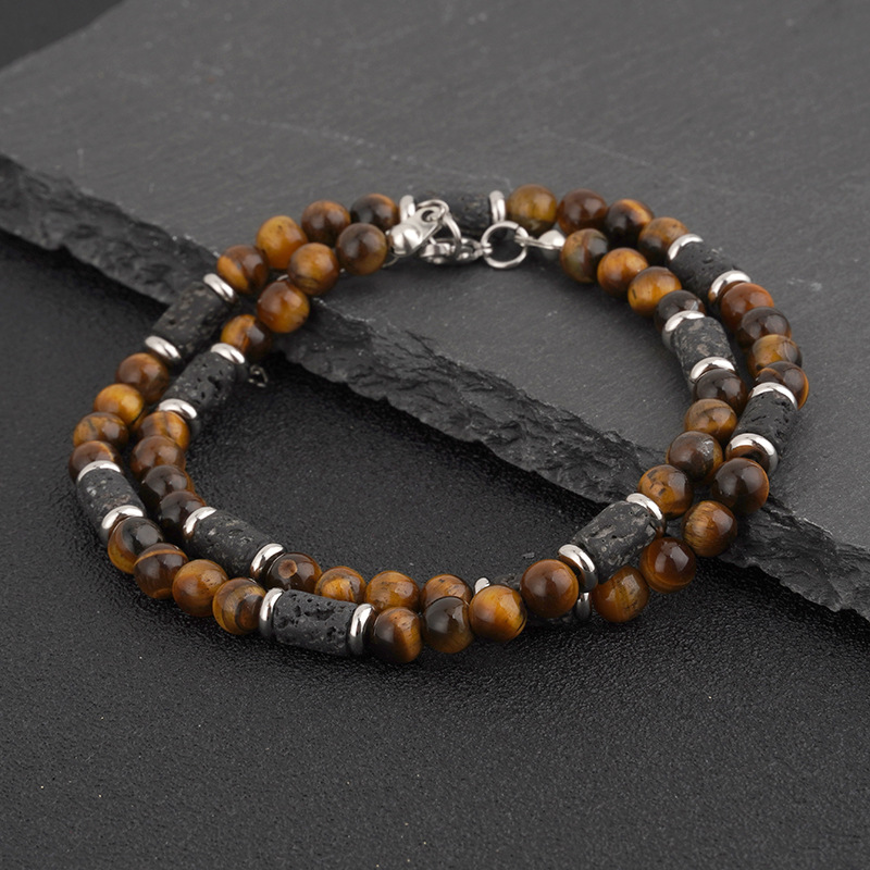 European and American New Style Tiger Stone Natural Stone Men's Fashion Trend Handmade Beaded Simple Black Agate Volcanic Stone Necklace