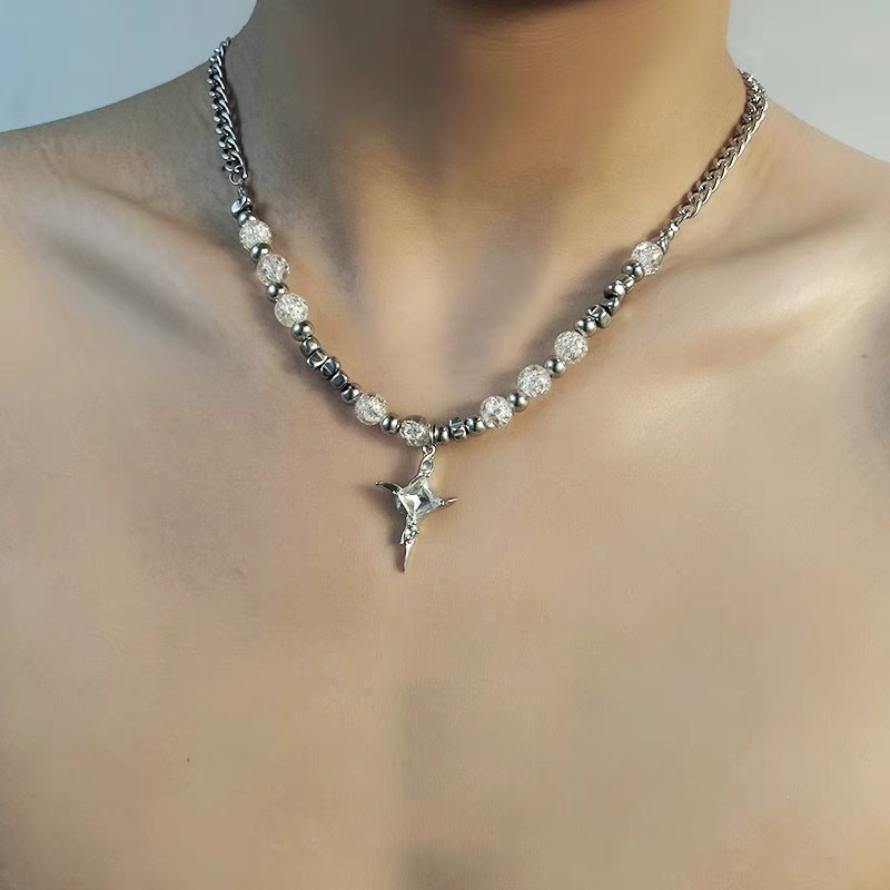 Ice Crack Bead Cross Star Necklace Men's Niche High-end Stitching Pendant Sweat Chain Distinctive Collarbone Chain Accessories Women