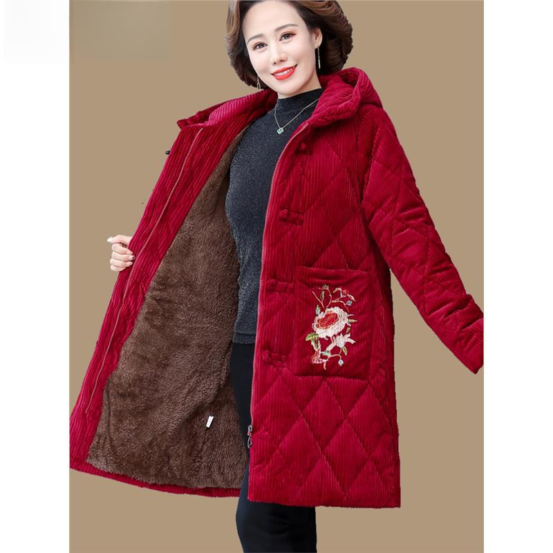Middle-Aged and Elderly Women's Winter Cotton-Padded Jacket with Fleece Lining, Thickened Hooded Cotton Coat for Ladies and Grandmothers, Mid-Length Corduroy Cotton-Padded Jacket