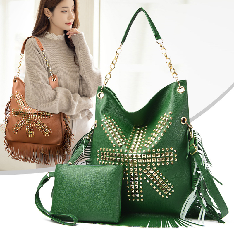 Cross-border 2025 New Bag Wholesale European and American Fan Tassel with Punk Rivet Large Capacity Women's Shoulder Crossbody Bag