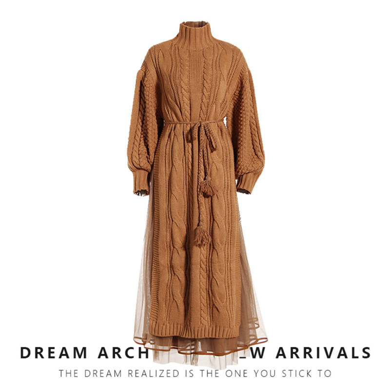 Long Stand-Up Collar Lantern Sleeve Skirt 2023 Spring Side Slit Knitted Sweater Dress Mesh Skirt Two-Piece Set