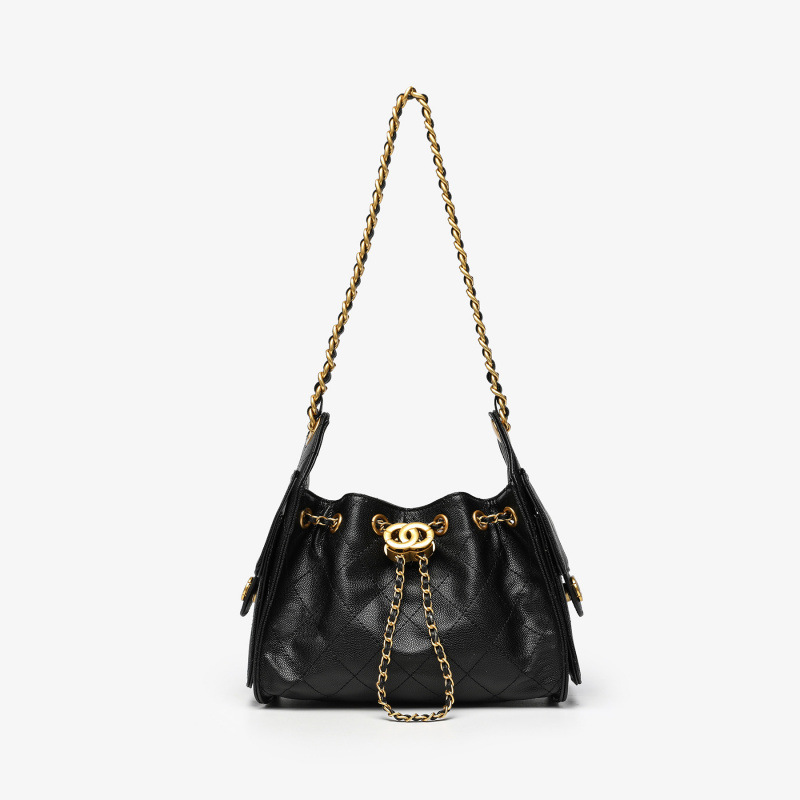 25S Diamond-Patterned Vintage Hobo Small Bucket Shoulder Bag Underarm Bag Large Capacity Drawstring Chain Women's Bag Bucket Style