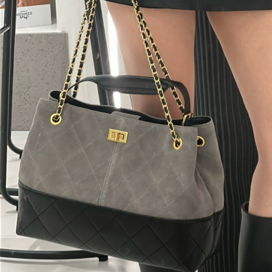 2025 Autumn and Winter New Style Nubuck Leather Quilted Cowhide Retro Chain Shoulder Bag Bucket Bag Contrasting Color Women's Bag Armpit Bag