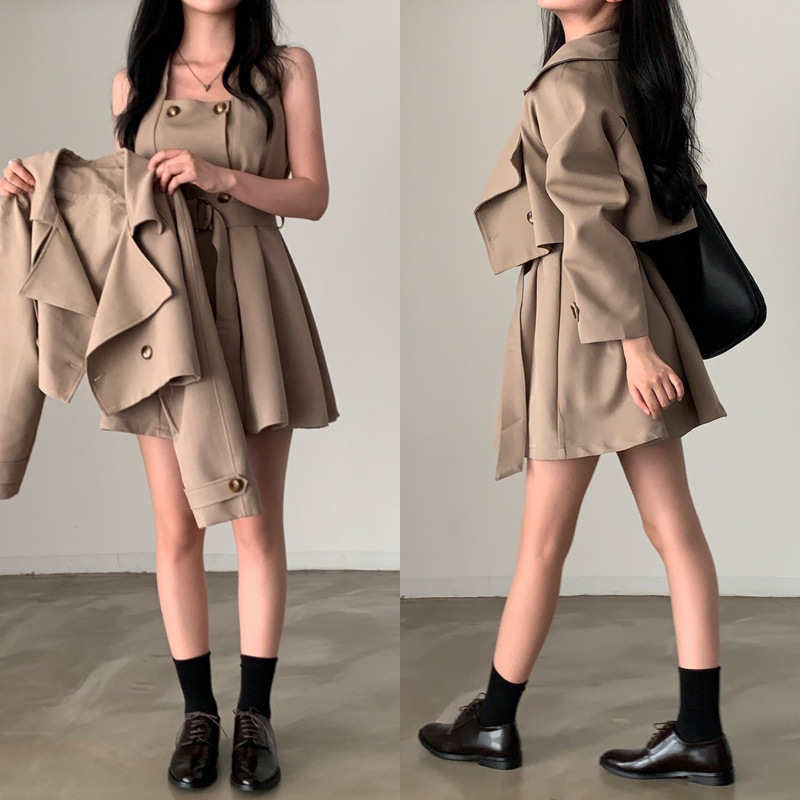 Shipped Size Update Korean Chic Autum New Retro Sleeveless Dress + Short Windbreaker Jacket