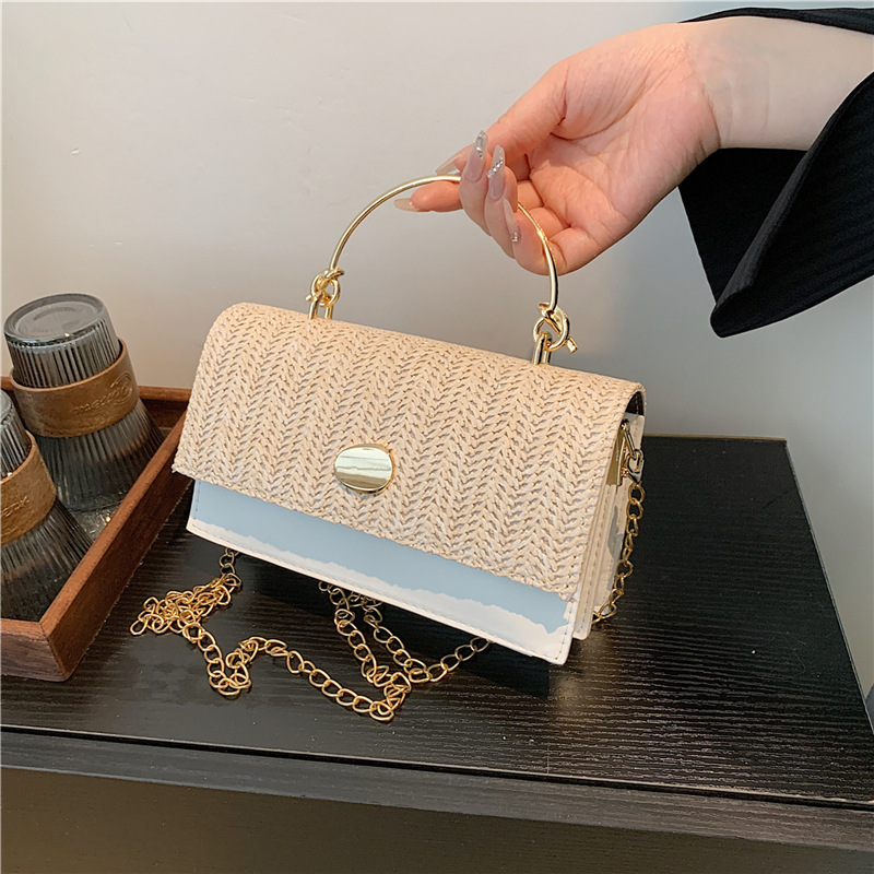 Nanfengfeng Fresh Style Straw Woven Bag, Color-Blocked Small Square Bag, Versatile Chain Shoulder Crossbody Bag, Fashionable Commuter Bag