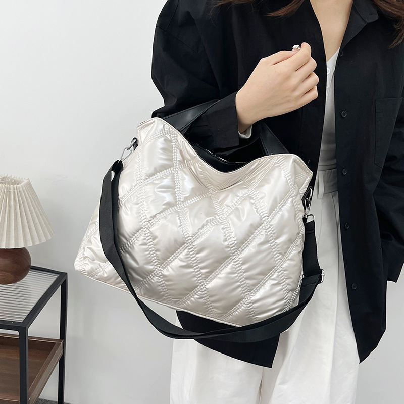 Down-filled cotton-padded jacket tote bag women's fashionable embroidery rhombus space cotton handbag simple solid color shoulder bag