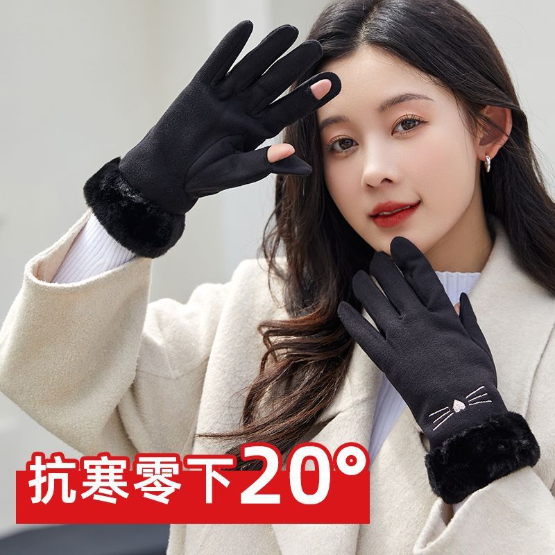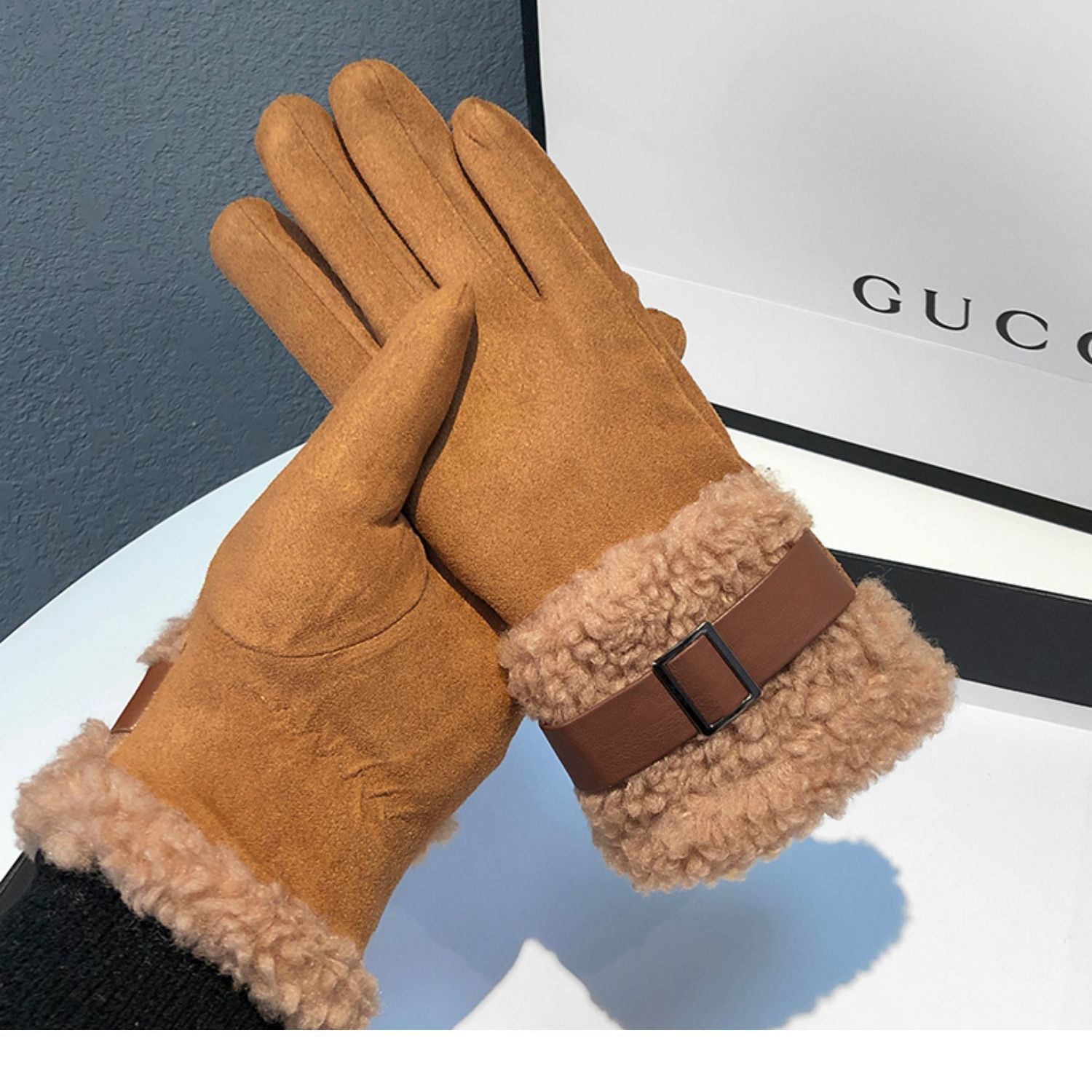 Autumn and Winter Popular Suede Fleece-Lined Thickeneded Warm and Cold-Proof Retro Versatile Driver's Five-Finger Touch Screen Women's Gloves