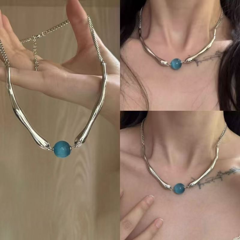 Y2K Necklace Female Punk Mechanical Style Niche Design Collar Blue Cat's Eye Necklace Stylish Versatile