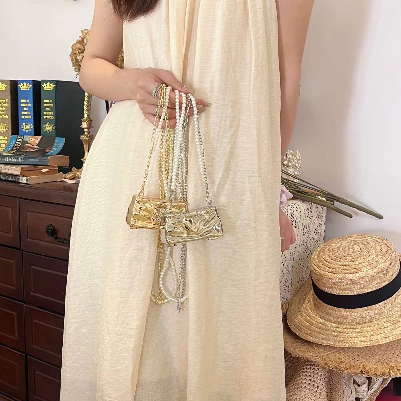 Metal mini bag women's 2024 new European and American fashion ice crack a small fragrant pearl chain mouth red envelope