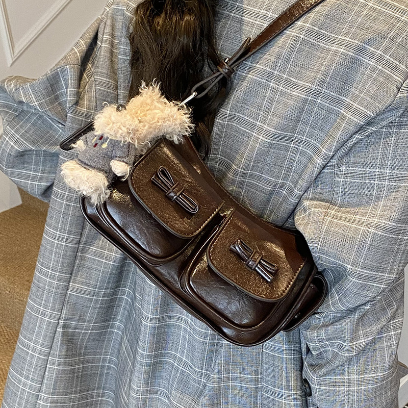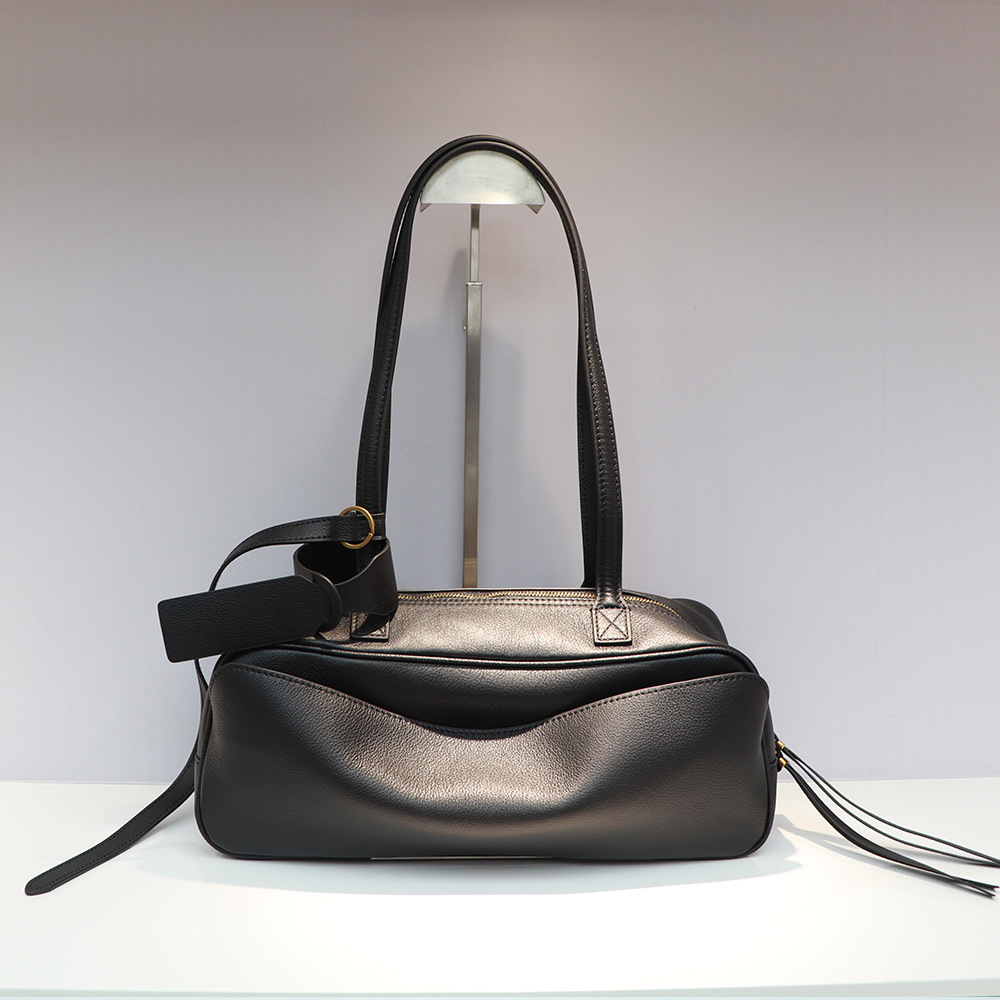 25 New Carrie Bowling Bag Retro Large Capacity Pillow Bag Lychee Pattern First Layer Cowhide Shoulder Underarm Bag