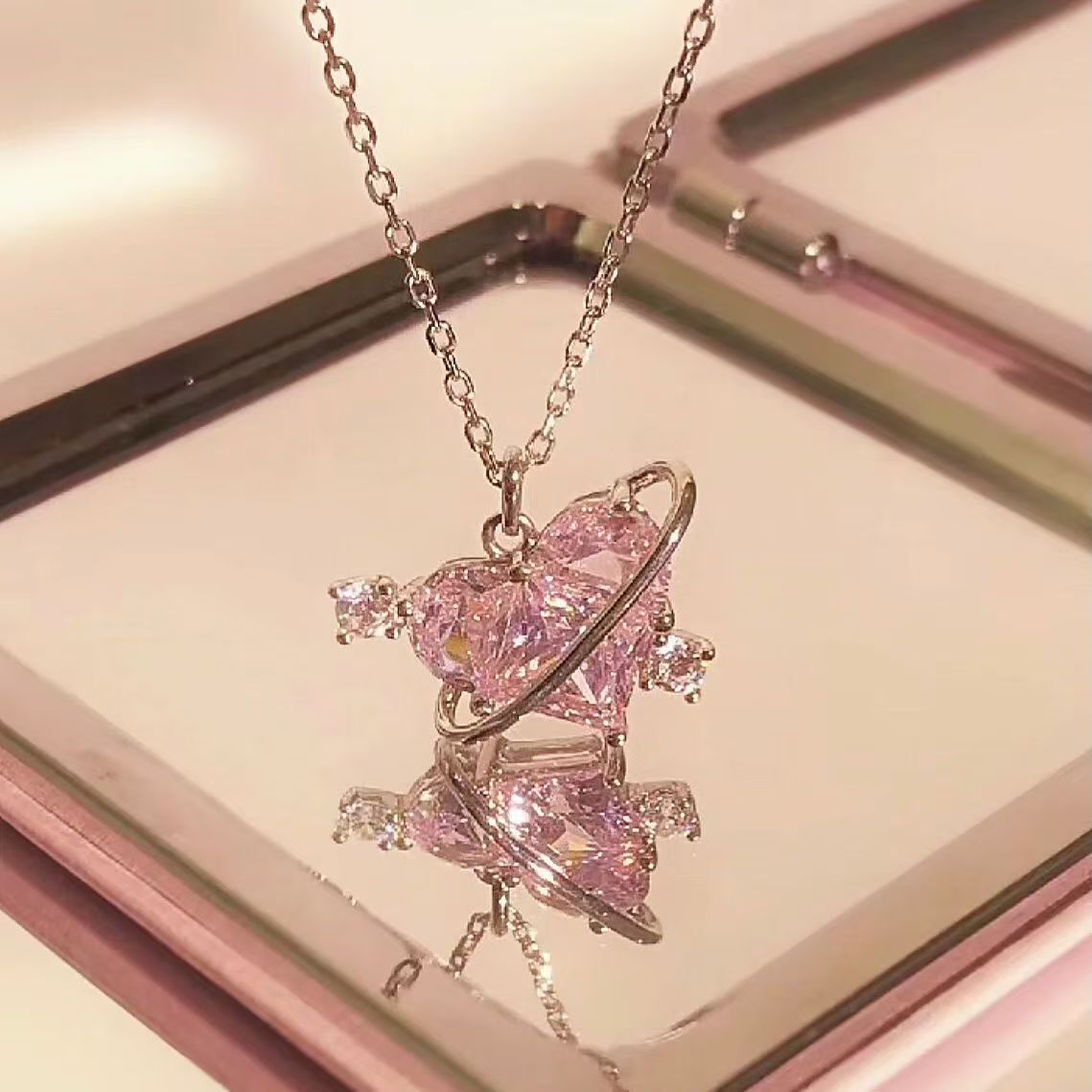 New Love Planet Necklace Female Ins Niche Design Light Luxury Sweet Elegant Girl's Pink Diamond Love Clavicle Chain