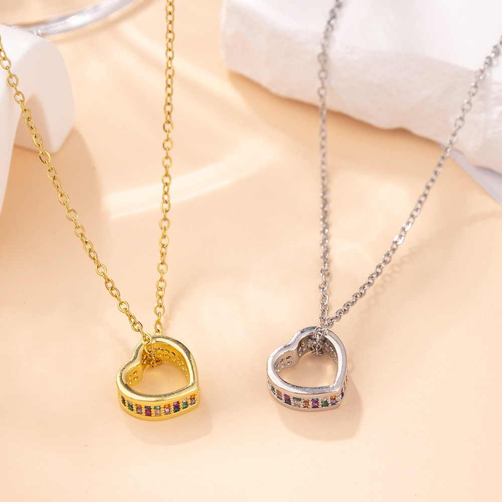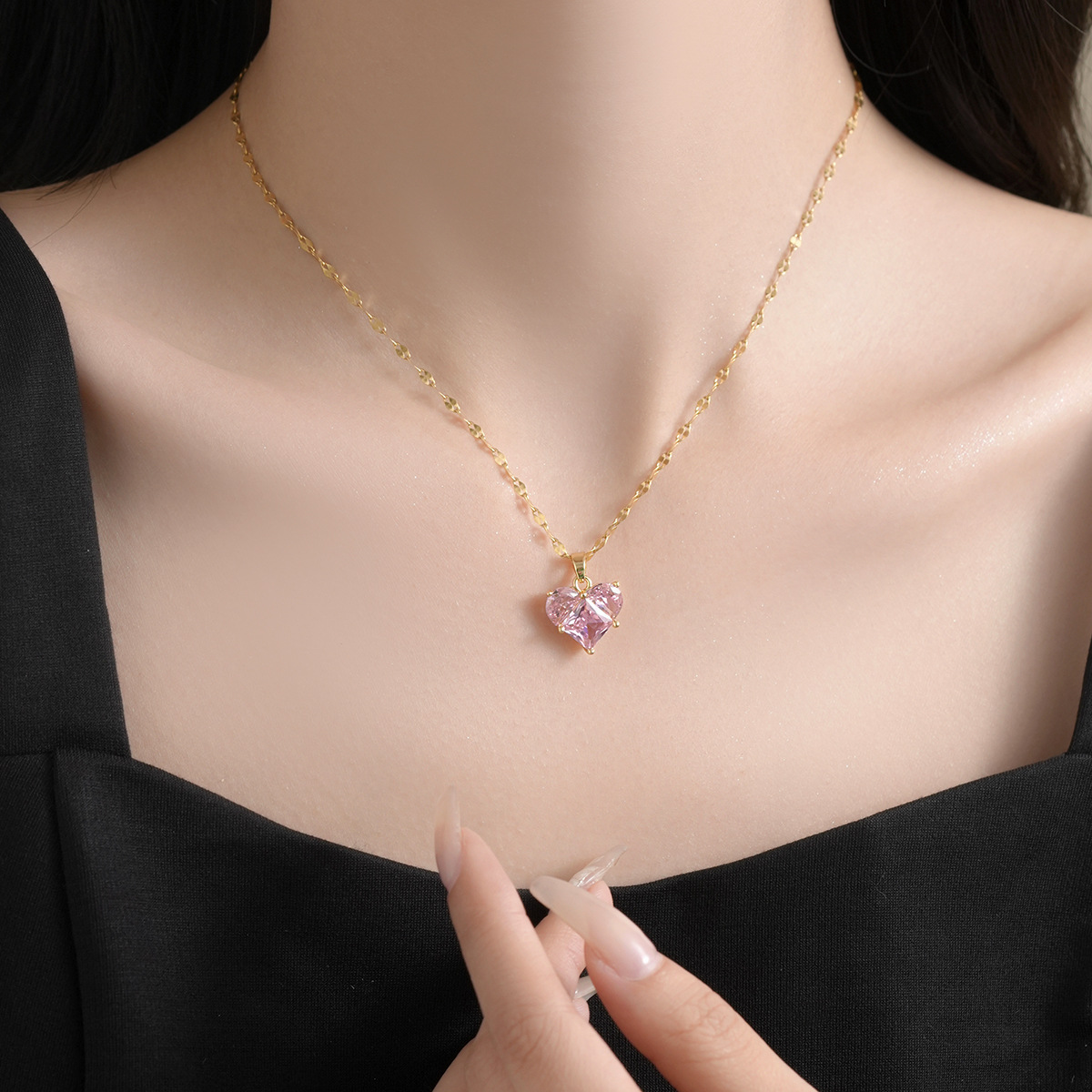 [Titanium Steel] Light Luxury Peach Heart Elegant Full Zirconium Inlaid Real Gold Necklace Women's Transport ins Cyber Red Clavicle Chain Accessories