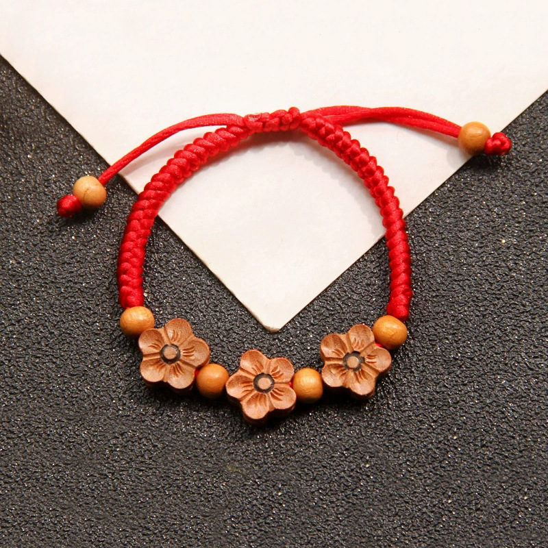 Little Red Riding Book Same Peach Wood Small Flower Leather Rope Hand Rope Women's Handmade Woven Peach Blossom Red Rope Gift Bracelet