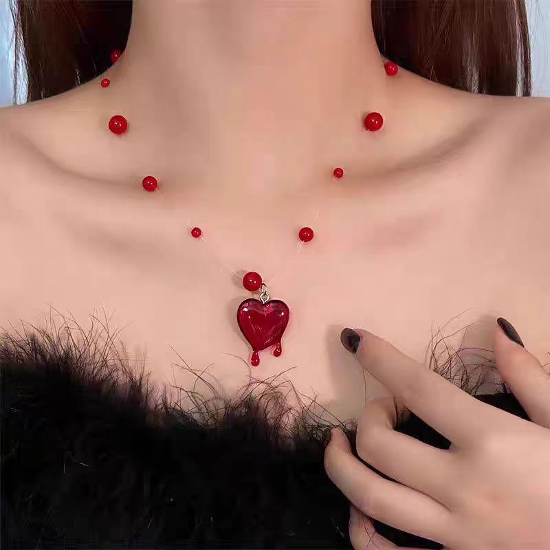 "Blood and Tears Heart" Sexy Style Red Lava Heart Necklace Retro Niche High-End White Clavicle Chain for Women
