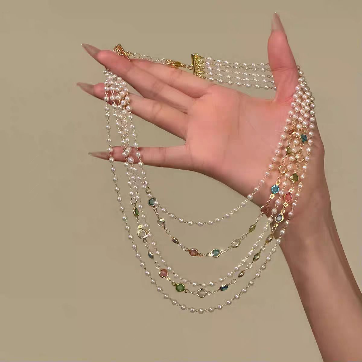 Vintage Dopamine Colorful Pearl Multi-Layer Necklace Light Luxury Layered Clavicle Chain for Women