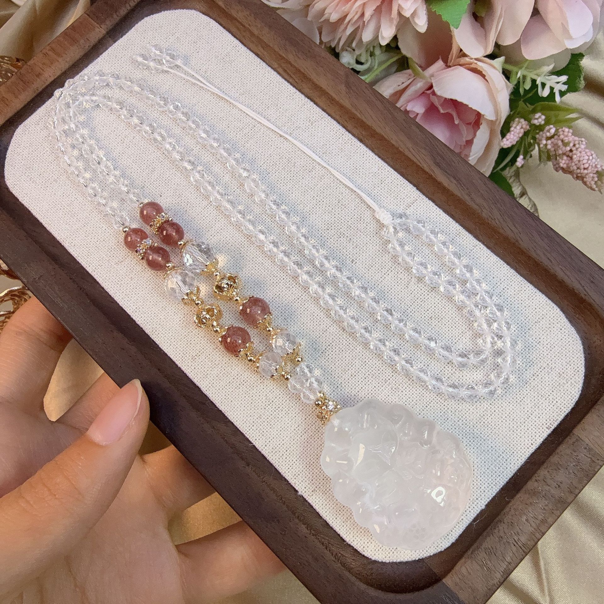 Natural Pink Crystal Single Ring Bracelet Women's Large Grain Single Bead White Crystal Snowflake Advanced Accessories Bracelet Pink Crystal