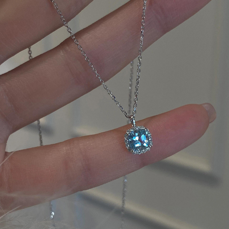 Small Sugar Cube Necklace for Women, Light Luxury Blue Zircon, Cool and Refreshing Style, Exquisite and Versatile for Commuting, Stainless Steel Clavicle Chain Wholesale