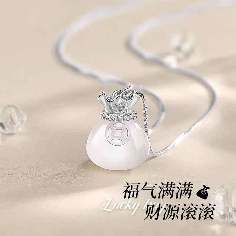 White Chalcedony Bag Necklace Women's All-match High-end Light Luxury Small New Chinese Style Exquisite High-end Simple Birthday Gift