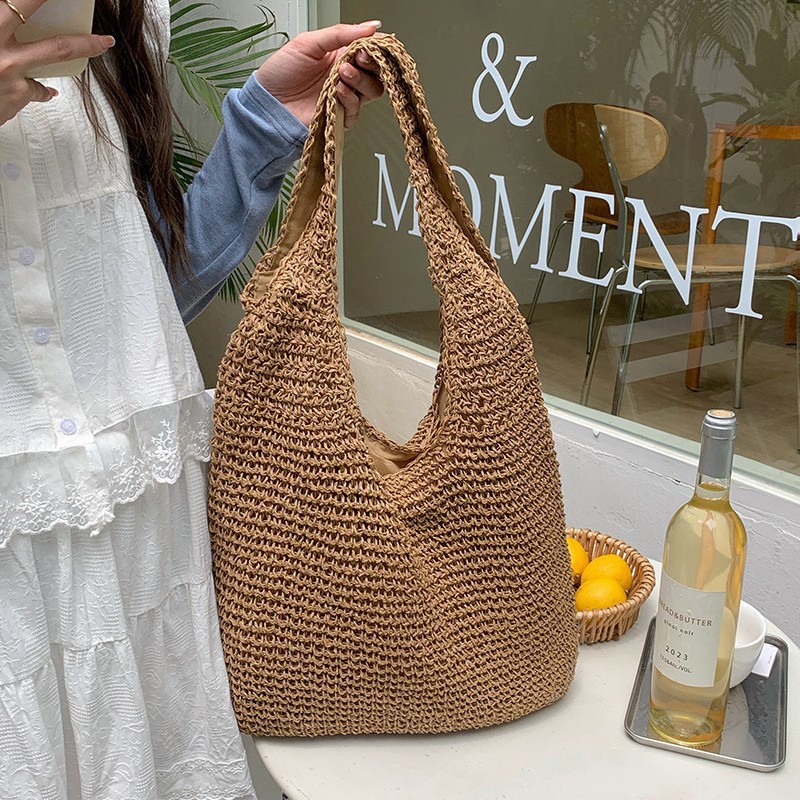 Versatile Straw Woven Bag with Lining, Handmade Woven Bag, Large Capacity Shoulder Zipper Tote Bag, Women's Beach Bag